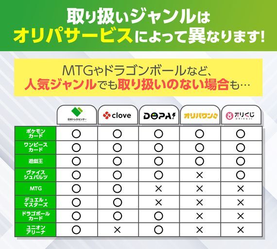 | サービス名 | 日本トレカセンター | Clove | Dopa | オリパワン | オリくじ | ポケットクロス | オリパレット | どっかんトレカ | アイリストレカ | スパークオリパ | エクストレカ | magiオリパ | カーデル | ミリオンオリパ | トレカの殿堂 | オリパエース | トレカレインボー | ポチオリパ | Cielトレカ | トレカ東京 |